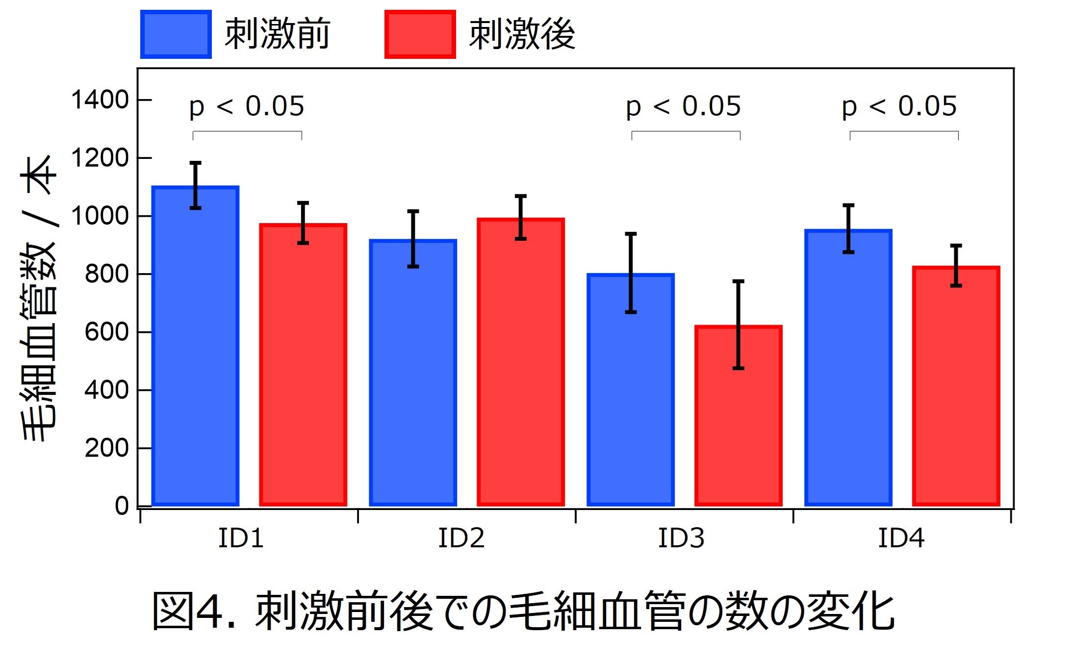また、テープで4名の前腕内側部7カ所で角層を数回剥離し、軽微な炎症に似た状態を作った前後を比較すると、毛細血管の数や面積が変化すること、その変化は人により異なることが確認できました(図4)。これは、同じ環境変化に対する血流の応答が人によって異なる可能性を示しており、同じ刺激で肌状態が悪化・改善する人の違いや、スキンケアの効果の違いなどの理解につながると考えます。