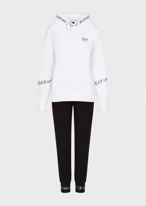 ご紹介するトラックスーツは、ワークアウトやレジャーに最適なフード付きスウェットシャツとジョガーパンツのセットです。さりげなくあしらわれたEA7 エンポリオ アルマーニのロゴ入りテープがポイントになっています。トップスはブラックとホワイトの2カラー展開で、いずれのカラーもスタイリッシュな印象です。より一層スポーツライフをお楽しみ頂くのにおすすめです。
