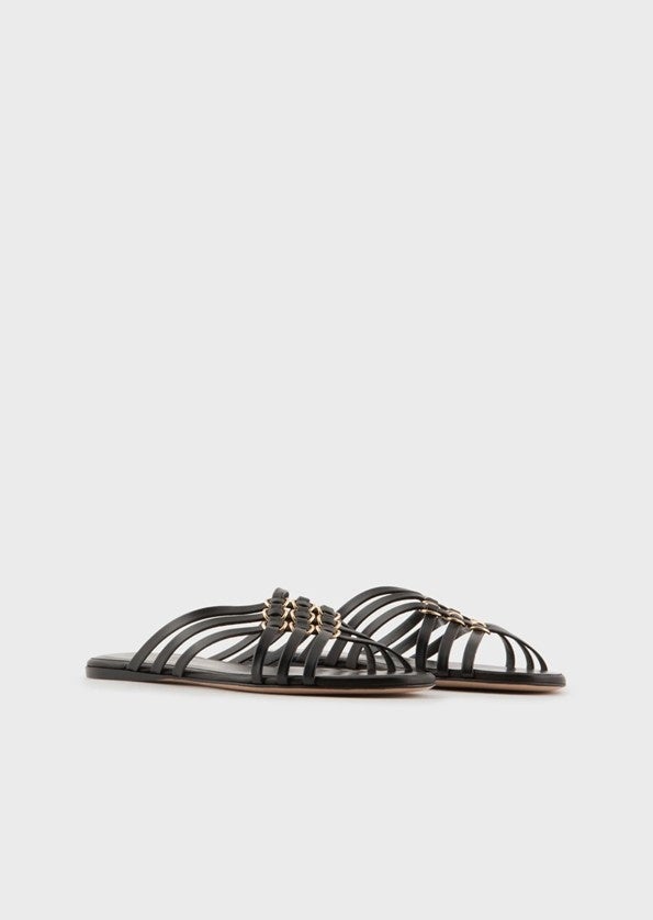 編み込みナッパレザー製のフラットサンダルは、ブラック地の編み込みモチーフの上にあしらわれた光沢感のある小さなゴールドメタルリングが遊び心を感じさせます。リゾートなどでの装いに洗練されたラグジュアリーな雰囲気をプラスする、これからの季節に最適なサンダルです。