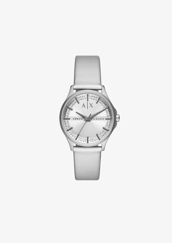 ステンレススチール製の36mm径のケースに、三針ムーブメントを搭載したウォッチは、シンプルながらシルバートーンで統一された*サンレイダイヤルとレザーストラップが都会的でクールな印象です。光の当たり具合や角度によって変化する文字盤の表情が魅力的な時計です。