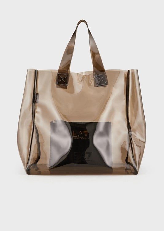 遊び心溢れる透明なPVCを使用したショッパー型バッグは、しっかりとしたハンドルと、バッグ内にはポーチをあしらい、容量たっぷりのサイズ感でアクティブなシチュエーションに最適なバッグです。前面にコントラストの効いたEA7ロゴをプリントし、オリジナリティをプラスしました。海辺やプールで自慢したくなるアイテムで、アウトドア志向のアクティブな方に喜ばれるギフトです。