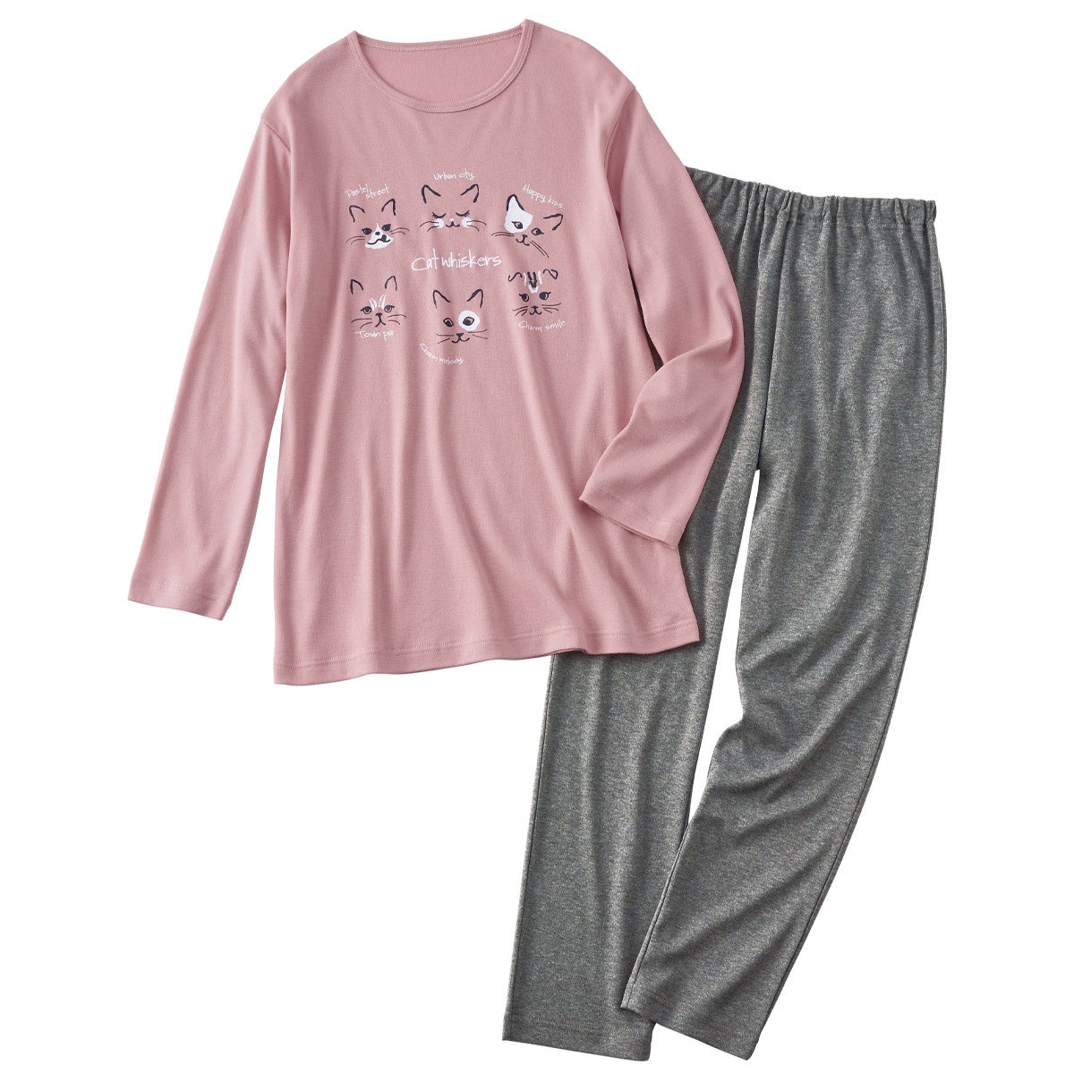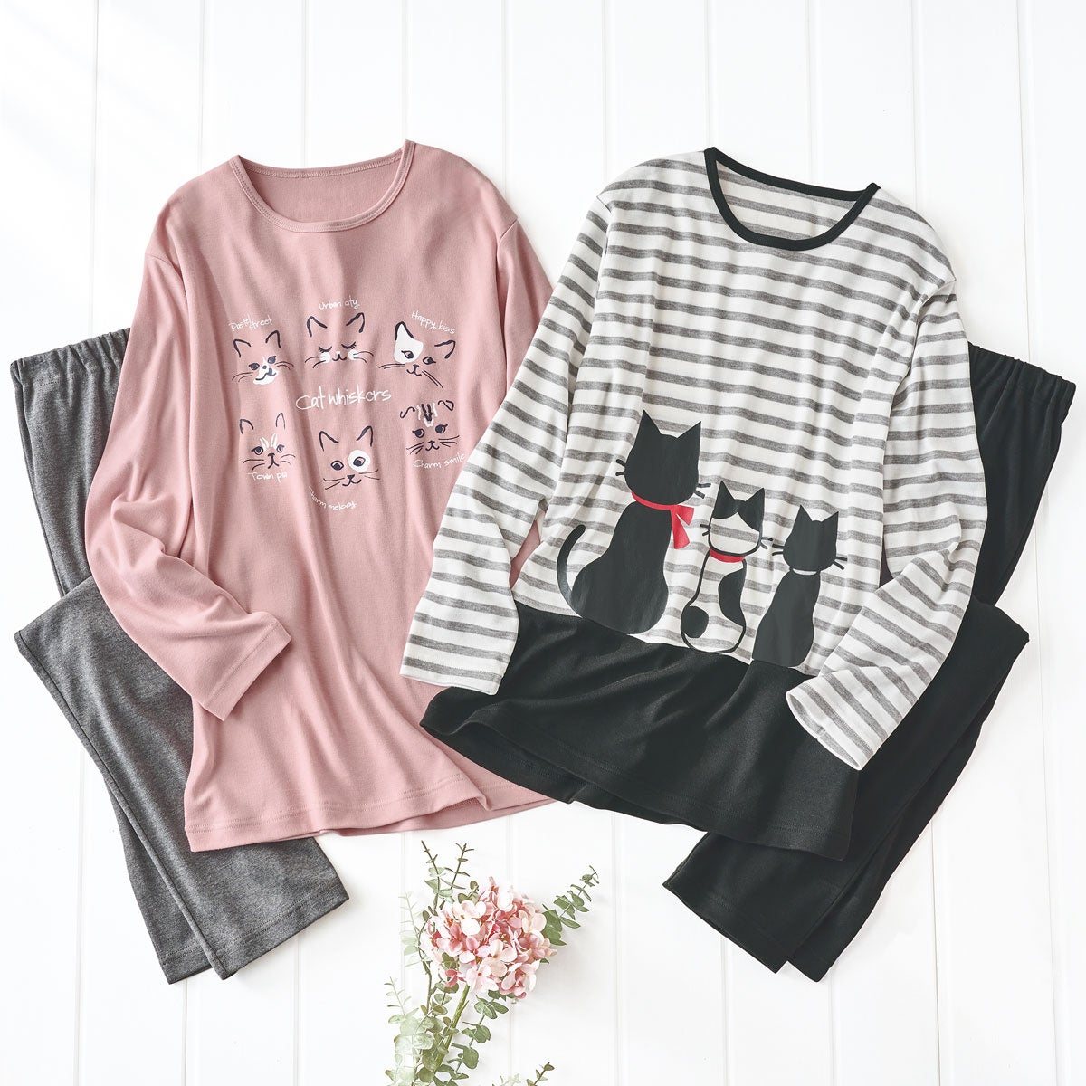 左『ねこプリントが可愛い!Tタイプパジャマ』(カラー:スモークピンク)