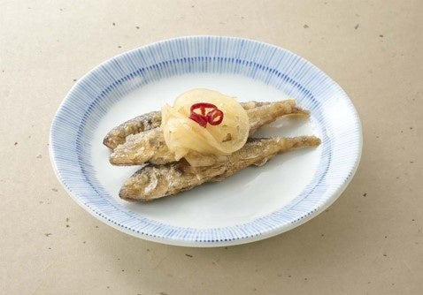 骨まで丸ごと食べられる鯵唐揚と玉ねぎのスライスを南蛮酢にじっくり漬け込んで味をしみこませました。甘酸っぱい味が食欲をそそります。