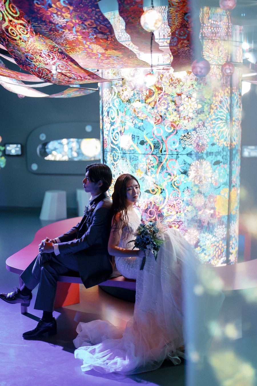 本プランでは、優雅に泳ぐ魚や多彩な生きものたちとの撮影はもちろん、切り絵アートに囲まれた「海の花鳥風月」や、いのちあるものだけが色を纏う真っ白な空間「White」などアーティスティックな展示空間を活かした撮影が可能です。生きものが息づく空間とアートが融合した世界の中で、その瞬間にしか残せない一枚を形にできる、広島もとまち水族館ならではのフォトウェディングプランです。