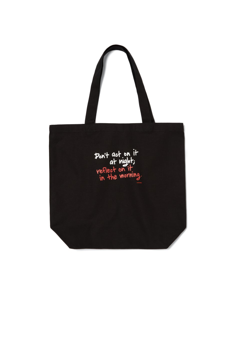 アン ミカさんの名言「夜はあかん、朝考えよう」の英訳を蓄光インクでプリントしたトートバッグは、暗い場所で見ると“Don't act on it(夜はあかん)”の文字が浮かび上がり、遊び心を感じられるアイテムです。