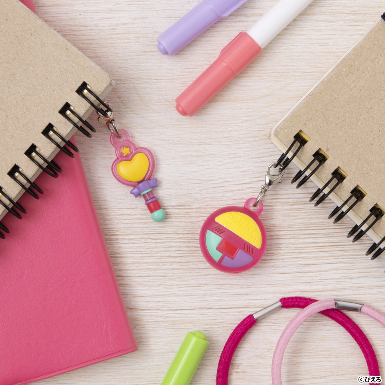 本商品は、TVアニメ放送40周年を迎えた「魔法の天使クリィミーマミ」の魔法のアイテムと、人気キャラクター「ネガ」「ポジ」を全高約4cmのサイズにしたマスコットです。付属のカニカンとシリコンパーツを用いてポーチやペットボトル、傘の持ち手などにつけることで、自分の持ち物の”めじるし”として使用することができます。