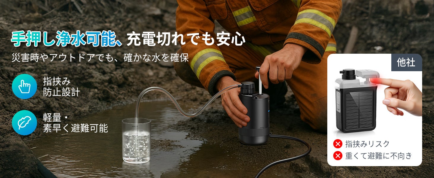 また、電池が切れた場合でも、手押し式で浄水が可能な電動+手押しの2WAY仕様を採用。