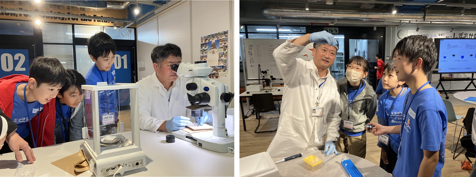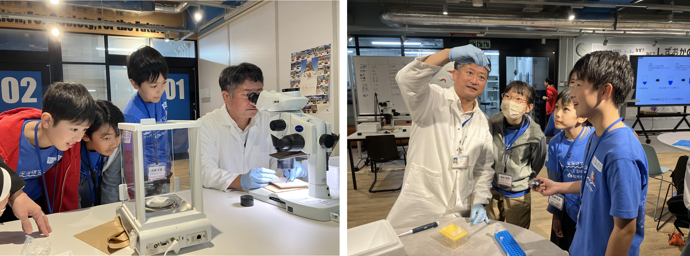 MaOI機構には研究施設(ラボ)が備えられています。キッズたちも研究の一環として、サクラエビの顕微鏡観察とDNAの抽出にチャレンジしました。まずは、実際にサクラエビの重さを図り、顕微鏡でオスとメスをチェック! オスとメスでどういう傾向があるのか、キッズたちで考えました。 また、自身の目で見る機会のない「DNA」を抽出してみました。サクラエビの組織の一部を薬液に浸すと、モヤモヤとした塊が見えてきました。これがサクラエビのDNAです。体験の後は、それぞれが進めている研究内容について、今後どんなリサーチをしたらよいのか、MaOI研究員の皆さんに質問タイム。 今日の講座の疑問点の他、調査の進め方、仮説の立て方、どんな方にアドバイスを求めたらよいのか、などこれからの研究発表に向けた質問も寄せられました。