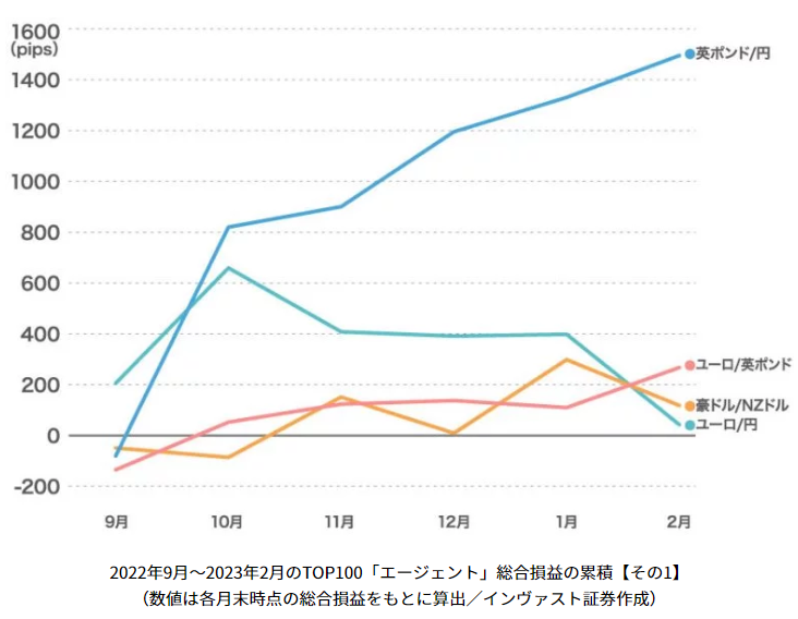 2022年9月~2023年2月のTOP100「エージェント」総合損益では、英ポンド/円が右肩上がりに成績を伸ばしました。期間中の英ポンド/円の値動きを振り返ると、上昇もしくは下落のトレンドが明確に現れていたとはいえませんが、日々の値動きは他の通貨ペアに比べ大きかった方でしょう。英ポンド/円の「エージェント」は、その荒波をうまくトレードしてきたといえます。