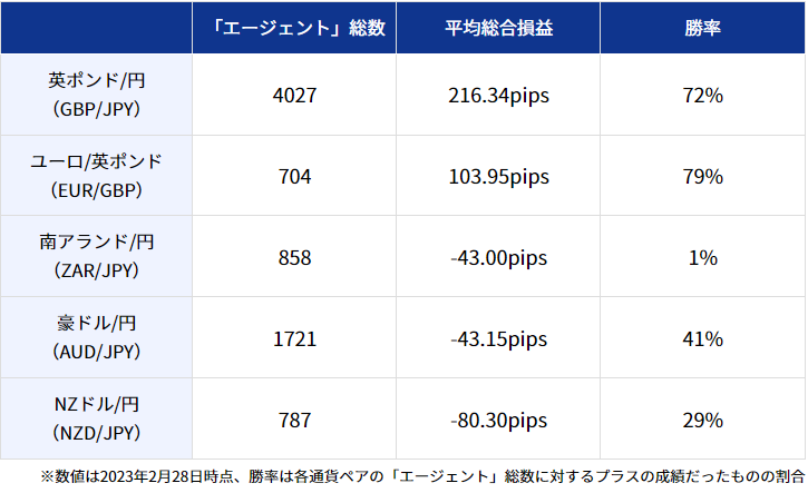 3位の南アランド/円はこれまで上位にランクインすることはありませんでした。勝率も1%なので、現状の「エージェント」では取引しづらい通貨ペアといえます。その南アランド/円よりも平均総合損益がマイナスの通貨ペアが、2023年の2月は多かったということです。