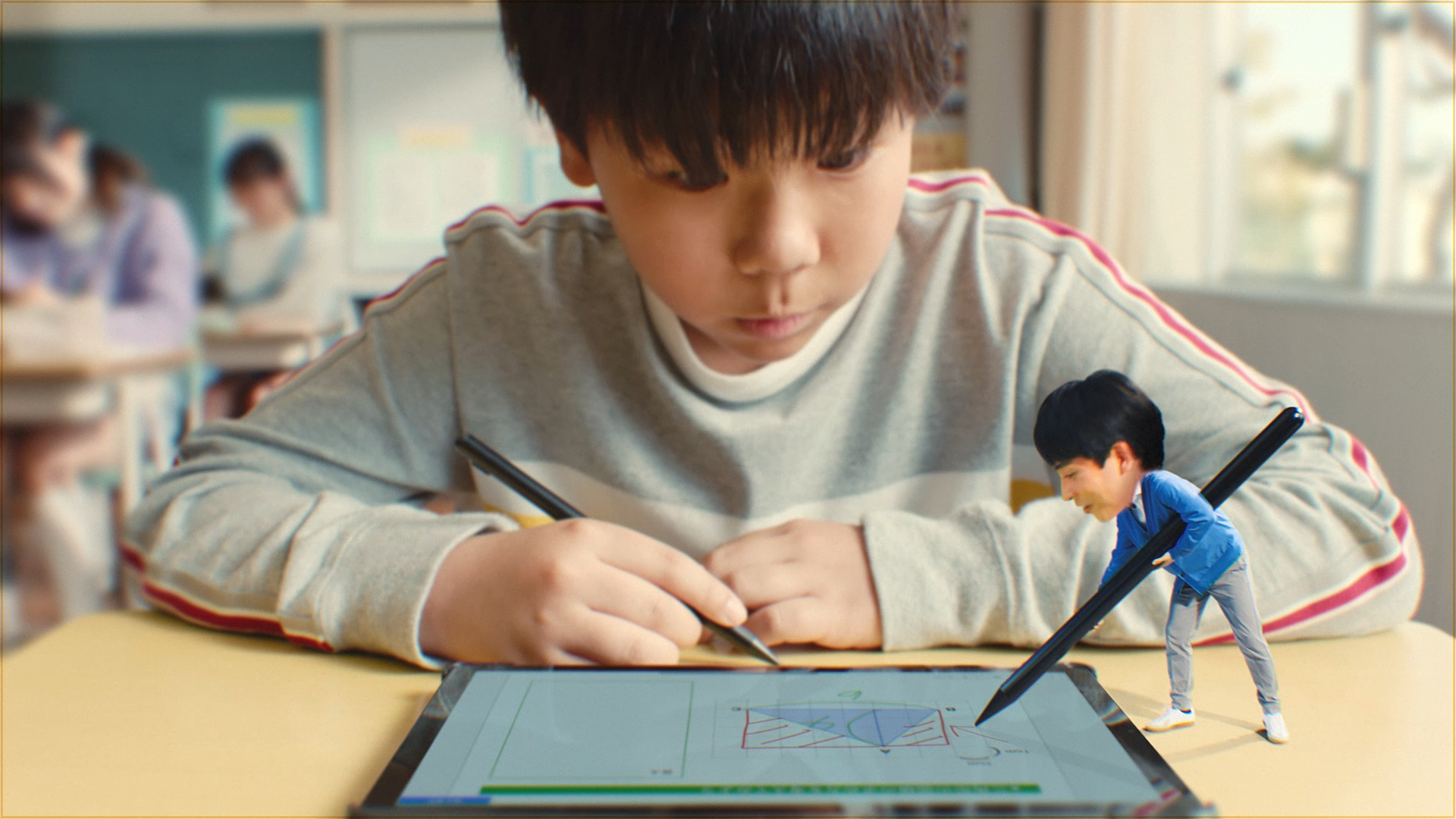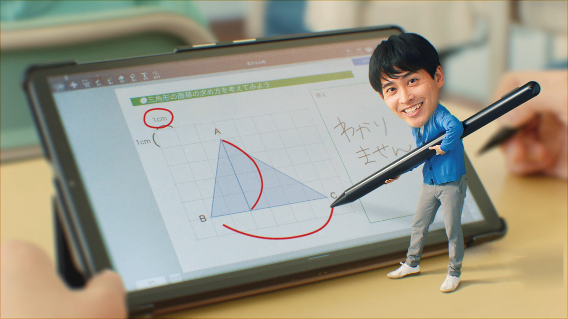 手のひらサイズに変身した平埜さんが、タブレット端末を使って問題を解く生徒たちに寄り添いながら的確にアドバイスを行うといったストーリーで、商品特徴である「まるで紙に書いているような使用感」や「学習状況のリアルタイムモニタリング」「モニタリング画面からの個別アドバイス」といった多彩な機能を伝えていきます。