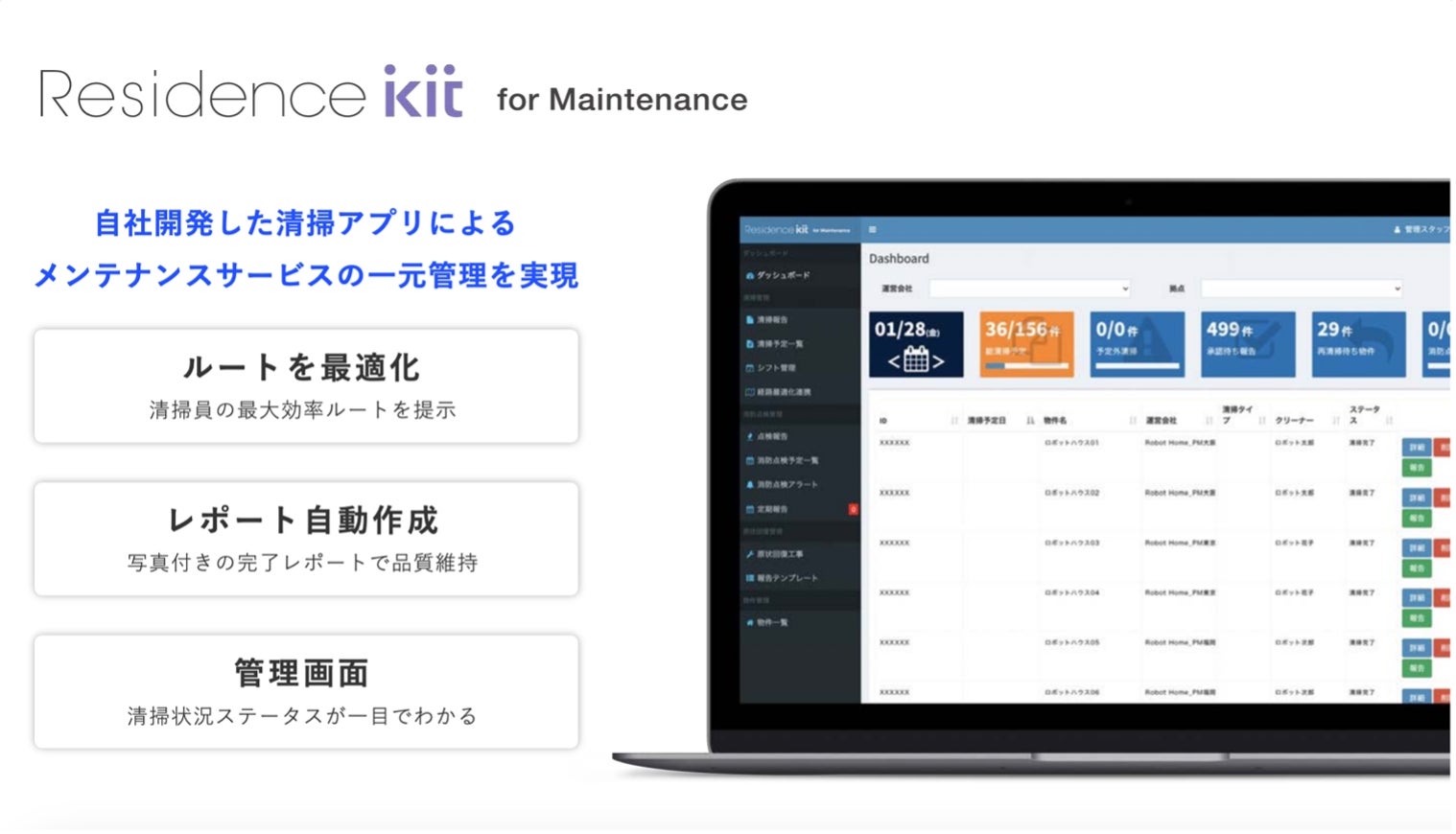 Residence kit for maintenanceは、賃貸不動産管理業務において、総合的なメンテナンスを一元的に管理できる、効率的で信頼性の高いプラットフォームアプリです。清掃業務に加え、原状回復工事や消防点検も当アプリ内で提供しています。