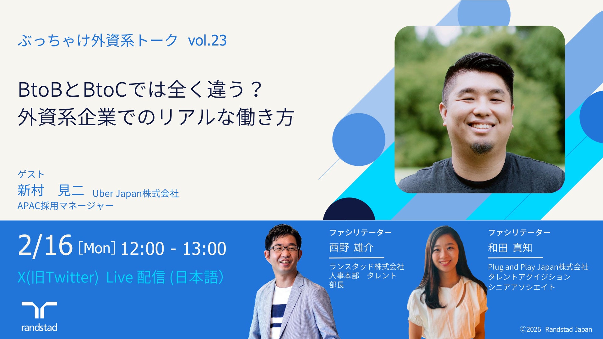 総合人材サービスを提供するランスタッド株式会社(本社:東京都千代田区 代表取締役会長兼CEO 道上 淳之介、代表取締役社長 猿谷哲)は、2026年2月16日(月)12時より、ソーシャルメディアX(旧Twitter)スペースにて、ライブ配信イベント「ぶっちゃけ外資系トーク」の第23回目を配信いたします。今回は、Uber Japan株式会社より、APAC採用マネージャーの新村 見二氏をゲストにお迎えします。