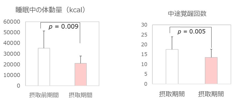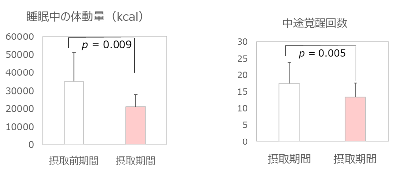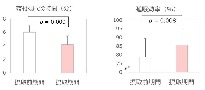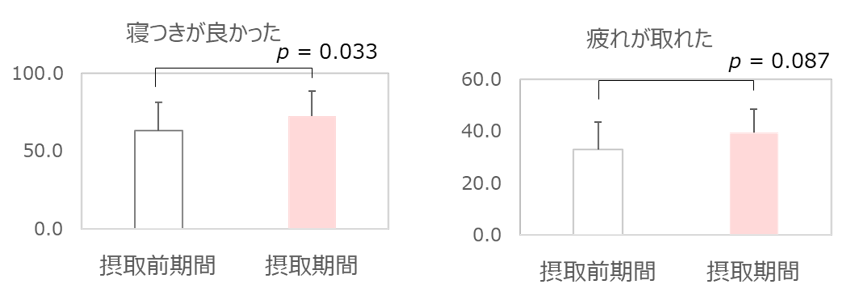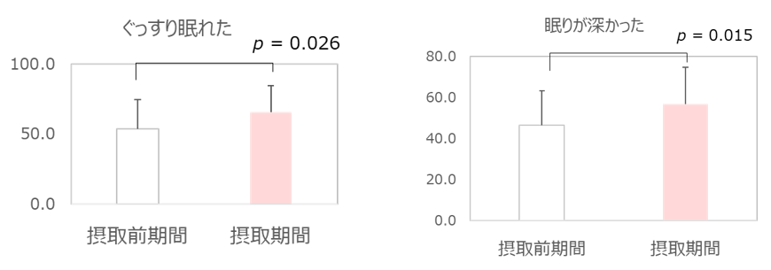 摂取前に対し、摂取期間では、海外ツアー同行時の寝つきや熟眠感、眠りの深さ、睡眠効率、中途覚醒などの改善がみられ、被験者の主観、および客観ともに睡眠の質が改善していることが確認されました。