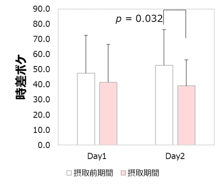 摂取前と比べ、摂取期間では、海外ツアーで渡航した2日目の時差ボケが軽減されました。