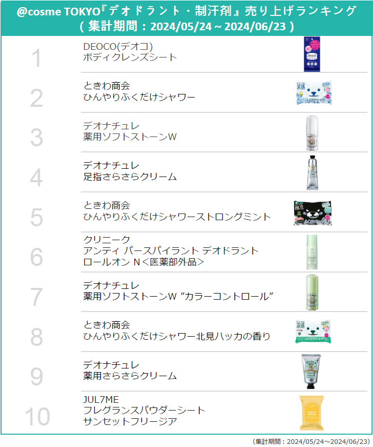 2.@cosme TOKYOデオドラント・制汗剤売り上げランキング(集計期間:2024/05/24~2024/06/23)