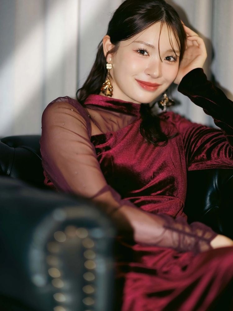 ベロアやチュール、サテンなどの異素材合わせと上品な肌見せデザインが美しさを引き立てるホリデームード高まるデザインに注目です。