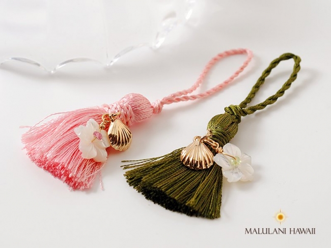 願いを育むシェルで作られたプルメリアに、ペリドット、ピンクトルマリンが添えられた愛らしいチャーム付きのタッセルは、ピンク、グリーンの2色展開。キラキラと小さな粒が美しい水晶チップは、200gの大容量です。