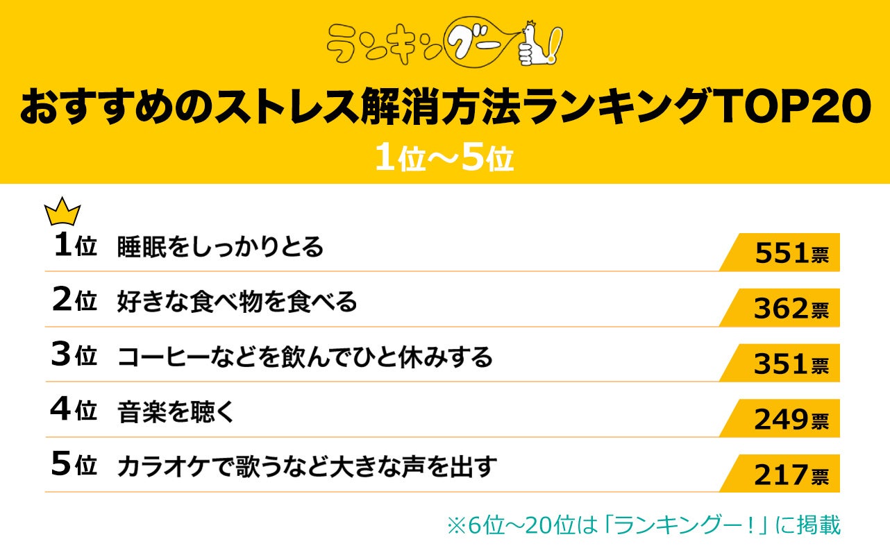ランキングー!ではおすすめのストレス解消方法をピックアップし、ランキングを調査。10~50代の男女(性別回答しないを含む)5,247名にアンケートを行い、TOP20を決定しました。ここではTOP5をご紹介します。