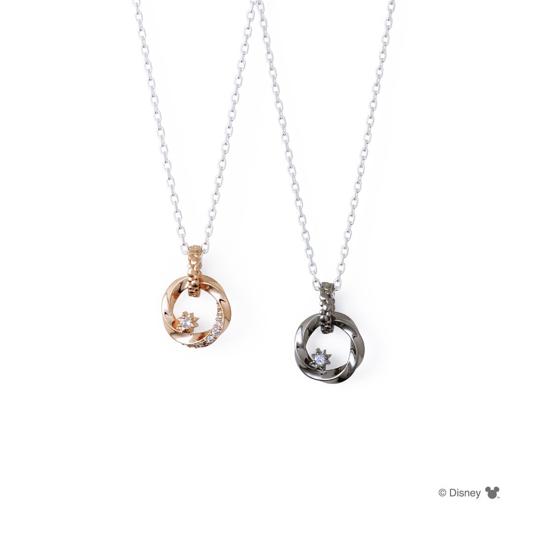 なめらかなツイストが美しい、サークルモチーフのペアネックレス。