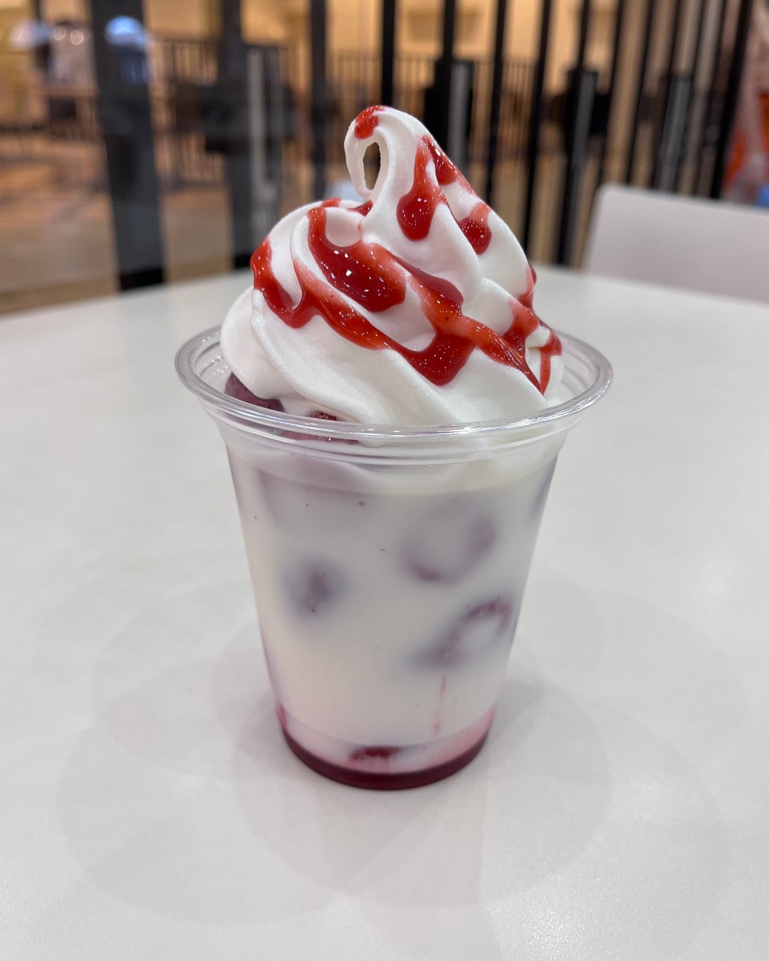 氷の代わりにいちごを入れた、いちご好きにはたまらないひんやりフロートです。数量・期間ともに限定!いちごをつぶしながら、牧場自慢のミルクとともにお楽しみください。