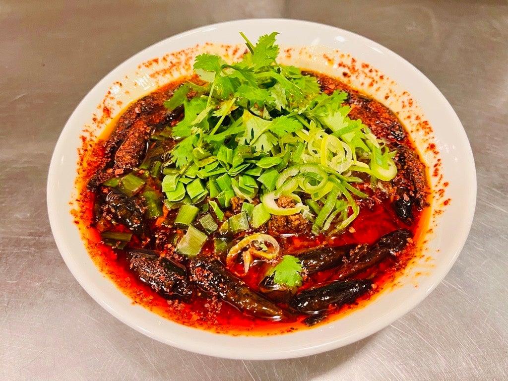 赤唐辛子で辛さを出した醬油スープに、青唐辛子と麻辣醤を加え、さらに唐辛子の粉末もトッピングした激辛メニュー!