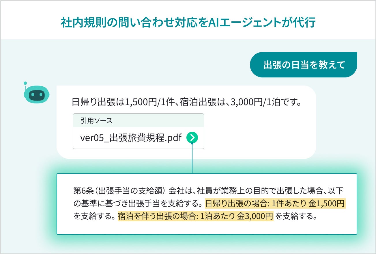 「社用携帯の利用ルールを教えて」、「10万円以上のオフィス備品を購入した場合の経費科目は?」など、日常的な言葉でAIエージェントにチャットで問い合わせるだけで、担当者に代わって自動で質問に回答します。回答は、登録した社内規則の資料を参照して作成され、参照元の情報も提示されます。