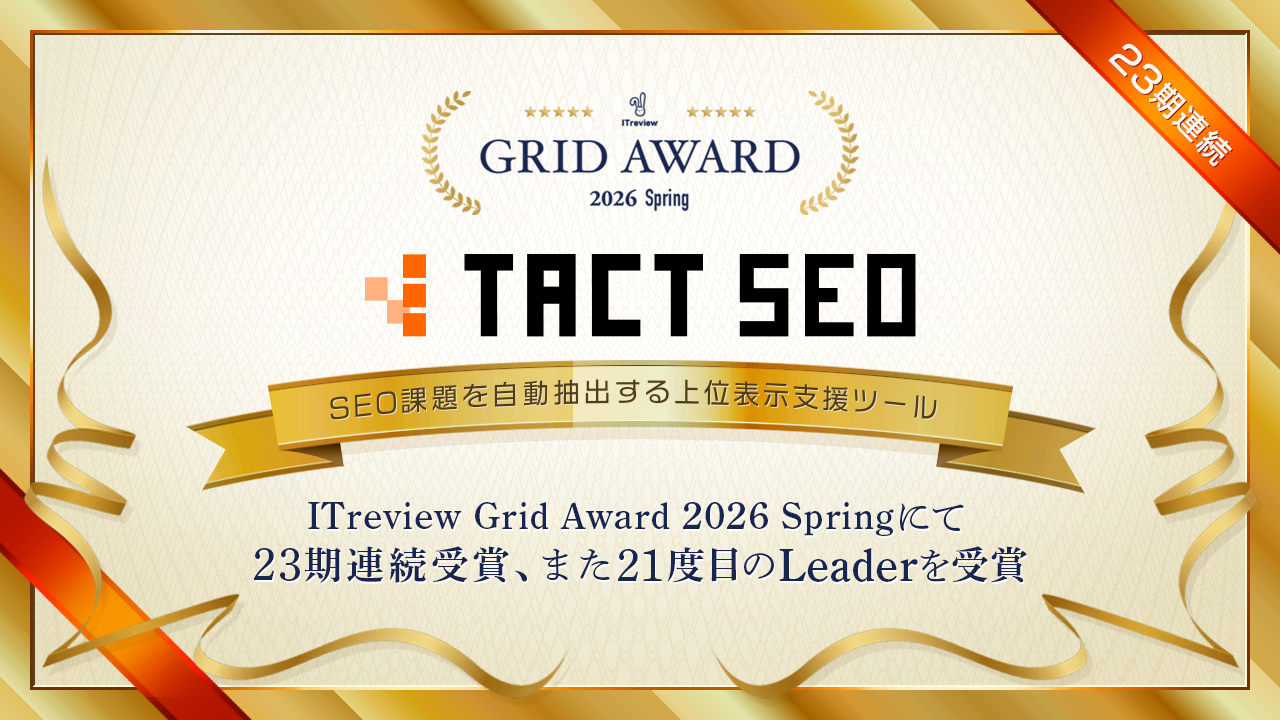 株式会社ウィルゲート(本社:東京都港区、代表取締役:小島 梨揮、以下「ウィルゲート」)が提供するAI×SEOツール「TACT SEO」は、アイティクラウド株式会社(本社:東京都港区、代表取締役社長 兼 CEO:黒野 源太)が主催する「ITreview Grid Award 2026 Spring」の「SEOツール」部門において、認知度とユーザー満足度が優れているサービスに贈られる「Leader」を受賞したことをお知らせいたします。今回でSEOツール部門は23期連続受賞、「Leader」の受賞は21度目(※1)となります。