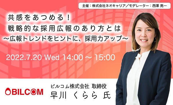 株式会社ネオキャリア(本社:東京都新宿区、代表取締役:西澤亮一、以下ネオキャリア)は、様々な経営課題を解決するためのヒントを得る場として、企業向けのオンラインセミナー『ネオキャリアTOP対談ウェビナー』を開催しております。2022年7月20日(水)は、ビルコム株式会社取締役 早川 くらら氏をゲストにお招きし開催いたします。