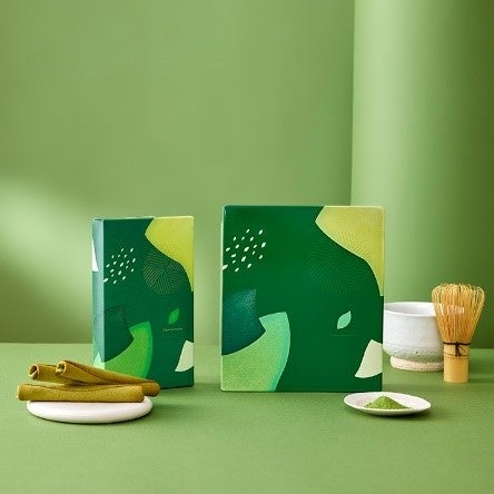 初夏のさわやかな風を運んでくれる、ご褒美気分高まる華やかなデザインに仕上げました。鮮やかなグリーンのパッケージには、石臼や茶葉、繊細なパウダーなど抹茶のモチーフを散りばめています。