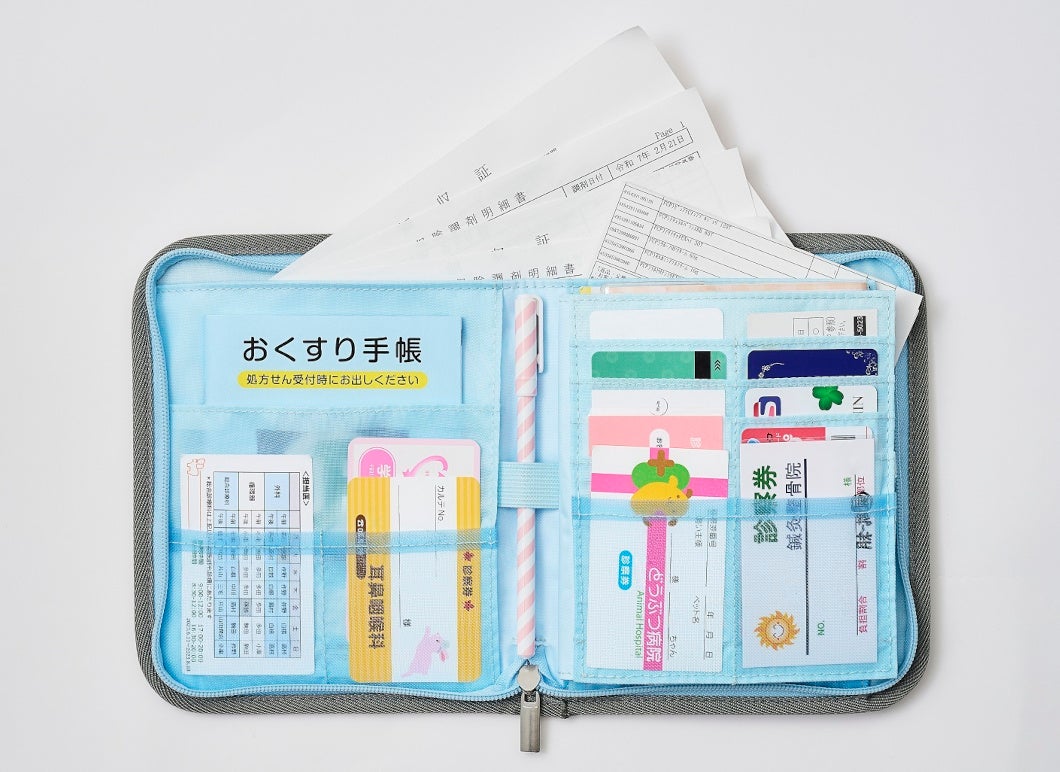 従来品同様、お薬手帳や母子健康手帳がぴったり入るポケットや、領収書も入る大きめポケット、小銭などをサッと収納できる外側ポケットなどを備えています。加えて今回のリニューアルでは、診察券などを入れるカードポケットの数を計13個に増やしました。