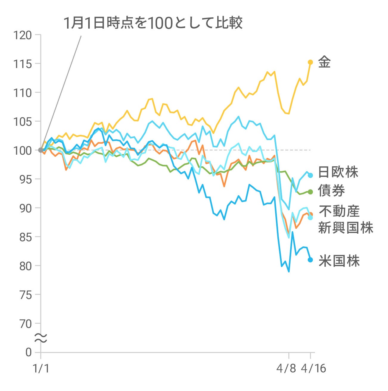 預かり資産・運用者数 国内No.1ロボアドバイザー(※1)「WealthNavi(ウェルスナビ)」を提供するウェルスナビ株式会社(本社:東京都品川区、代表取締役CEO:柴山和久、以下「当社」)は、相場が大きく動いた今年1月~4月中旬において、資産の種類を分散させることの効果を検証しました。米国株を中心に価格が下落した資産が多い中で、金の価格は反対に上昇していました。
