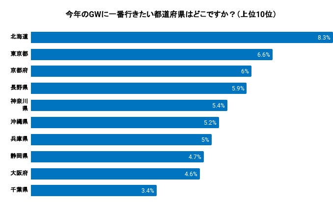 - 今年のゴールデンウィークにでかけたい都道府県は「北海道(8.3%)」が第一位という結果に