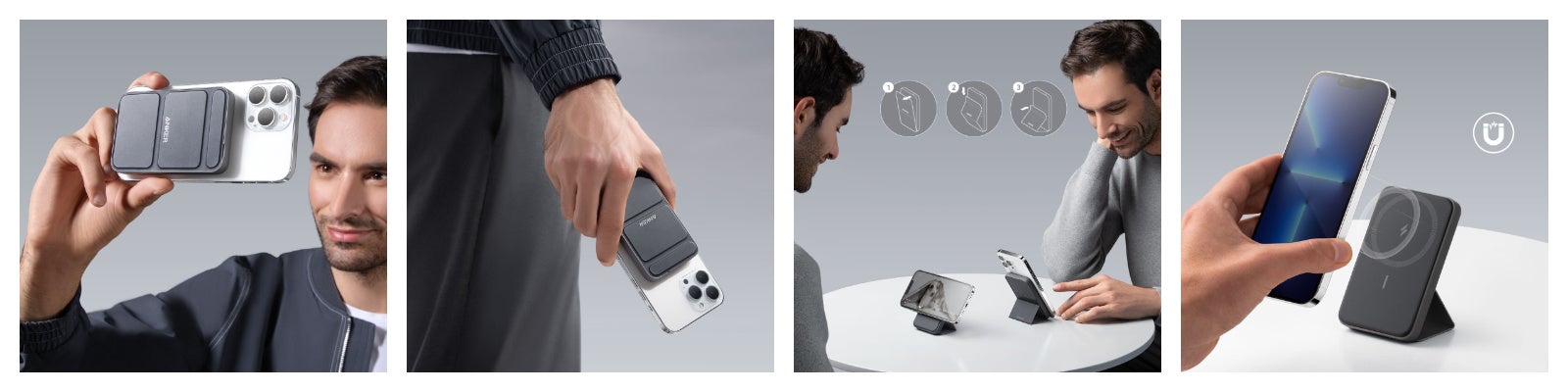 「Anker 622 Magnetic Battery (MagGo)」は、iPhone 13 / 12シリーズに強力マグネットで‘ピタッ’とくっつく、マグネット対応ワイヤレス充電器の製品シリーズ「Anker MagGo(アンカー マグゴー)」のモバイルバッテリーです。縦置き・横置きどちらにも対応した折りたたみ式のスタンドを背面に搭載し、薄型化と最大7.5Wというワイヤレス充電における高出力化の両立を実現致しました。ケーブル不要で、外出先でも握りやすく快適にiPhoneを充電することができます