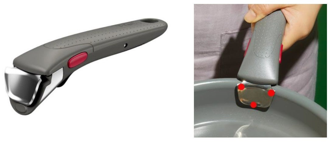 片手で簡単に着脱できるので、調理中の付け替えもスピーディーにできます。特許技術を駆使した専用取っ手は3点固定システムだから、安定感も抜群です。