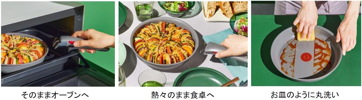 取っ手をはずせば、重ねてコンパクトに収納できるのはもちろん、オーブンに入れたり、そのまま食卓に並べることも可能です。またお皿のように丸洗いできるので、お手入れも簡単。ワンタッチで着脱できる専用取っ手は、「3点固定システム」でしっかり固定するので、食材を入れても取っ手がぐらつかず、調理中の安定感も抜群です。