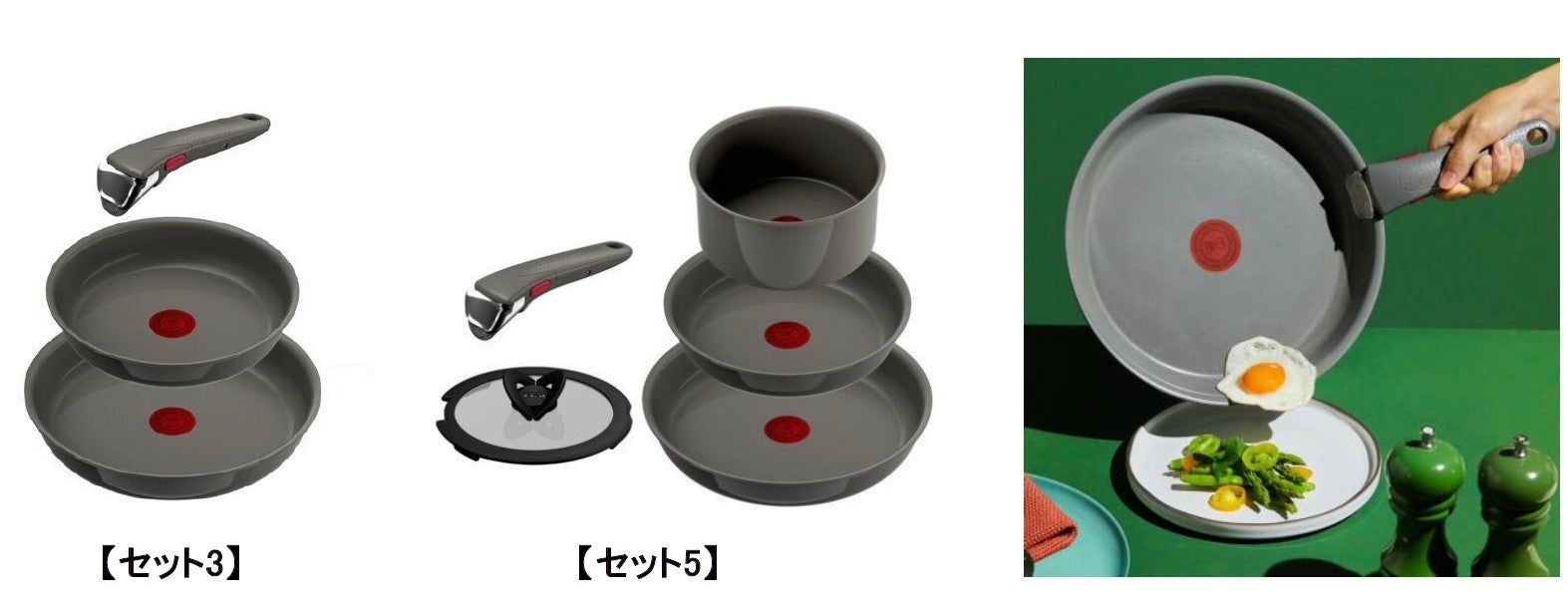 取っ手のとれるティファールに新たに加わった「IHセラミックグライドアースグレー」は、セット5(フライパン22cm/26cm、ソースパン18cm、ガラスぶた18cm、専用取っ手)と、セット3(フライパン22cm/26cm、専用取っ手)の2セットからお選びいただけます。※2