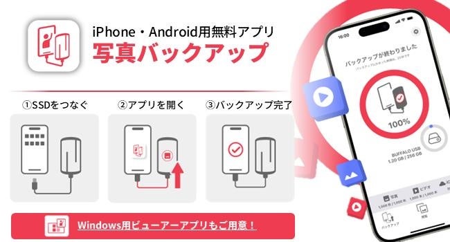 本アプリケーションはスマートフォンとSSDなどの外部USBストレージを接続し、アプリケーションを起動するだけで写真・ビデオをかんたんにバックアップできます。分かりやすい画面デザインとシンプルな操作性で、初めての方でも迷うことなくご利用いただけます。