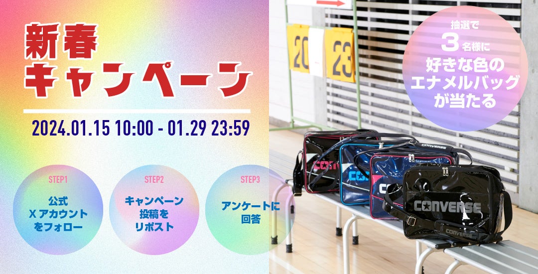 CONVERSE Basketball Wear公式Xアカウント(https://twitter.com/converse_basket)をフォローし、キャンペーン投稿をリポスト、アンケートにご回答いただいた方の中から抽選で3名様に、お好きな色のエナメルバッグをプレゼントします。