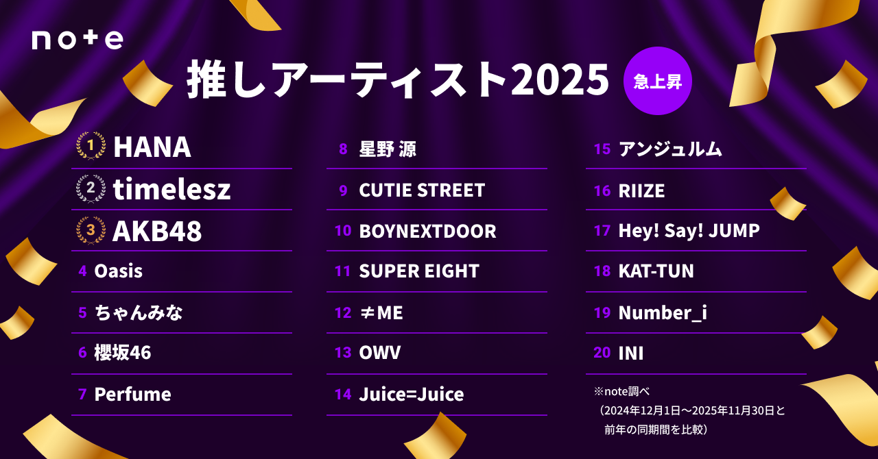 noteに投稿された“推し活”の記録から選出した「推しアーティストランキング2025」を発表しました。