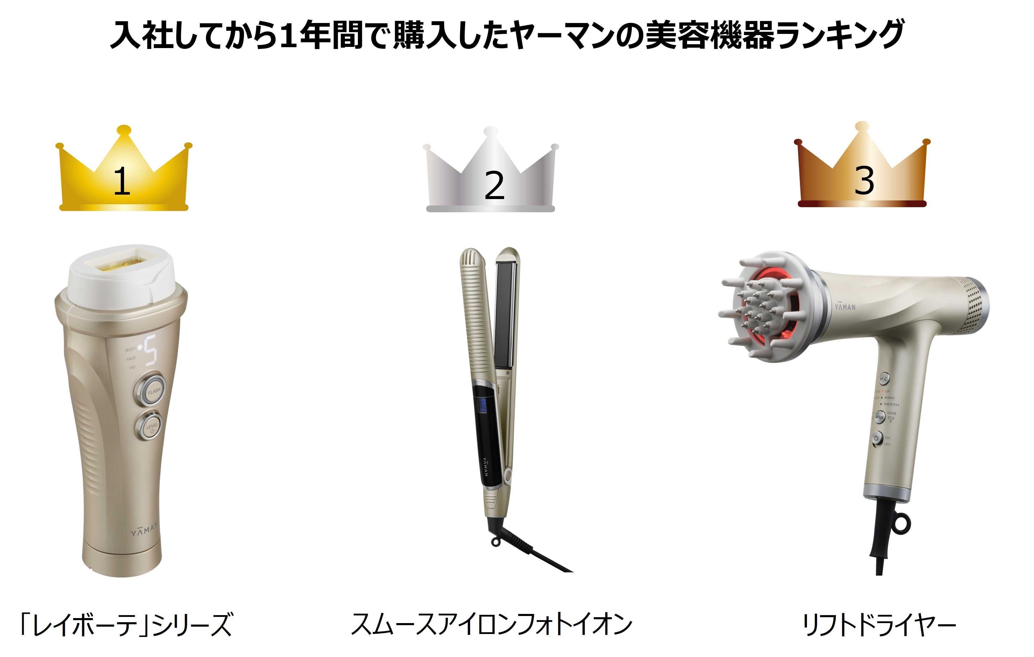 入社してから毎日美容機器に触れている入社2年目の社員は、実際に何を購入しているのでしょうか。リアルに自腹買いした美容機器と、その理由についても調査した結果、新入社員のランキングには登場しなかったムダ毛ケアのための光美容器「レイボーテ」シリーズが第1位にランクイン。実際にお客さまのお声に触れる中で欲しくなったという声も。第3位に輝いた『リフトドライヤー』は、どの社員ランキングにも登場する大人気製品という結果となりました。