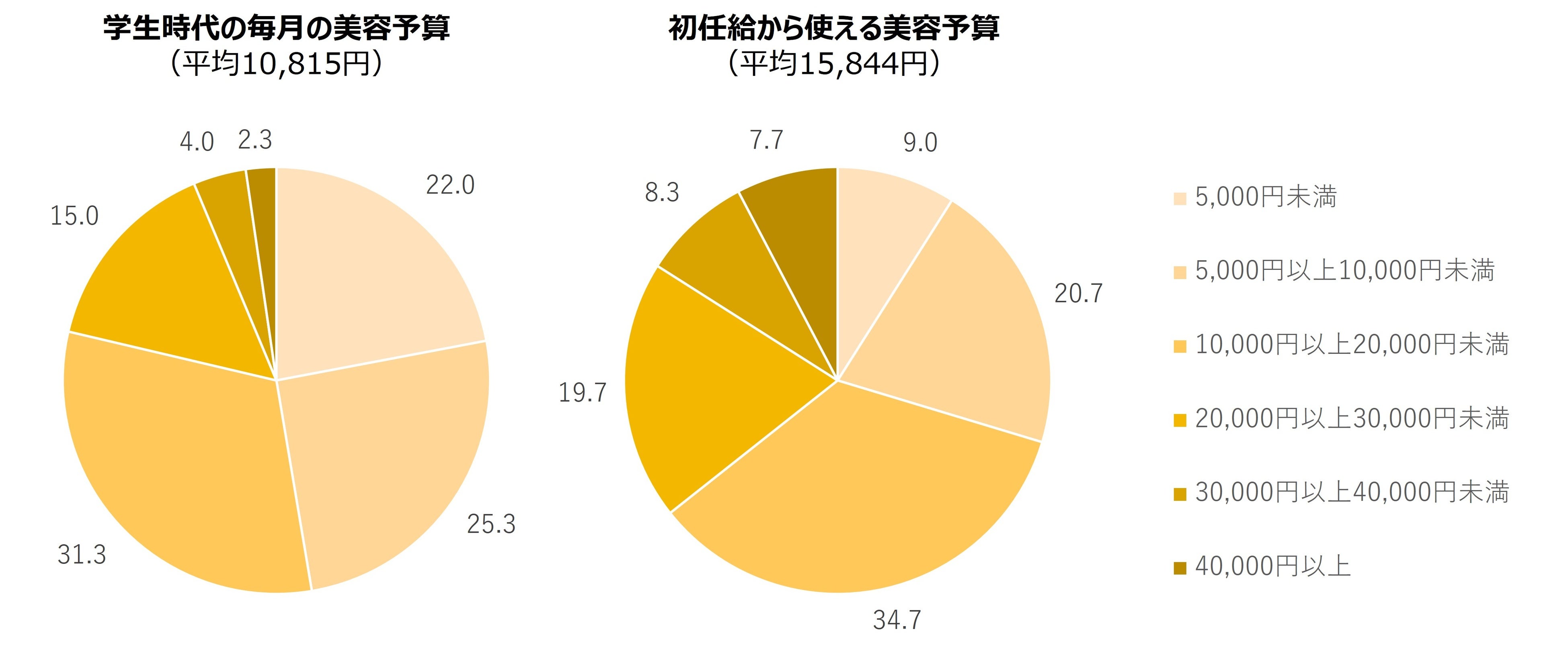 学生時代に毎月「美容」にかけていた予算は平均10,815円、社会人になって初めてのお給料で「美容」にかけられる予算は平均15,844円という結果に。学生時代の予算では最大でも50,000円という回答でしたが、初任給での予算は100,000円という人も数人見られました。