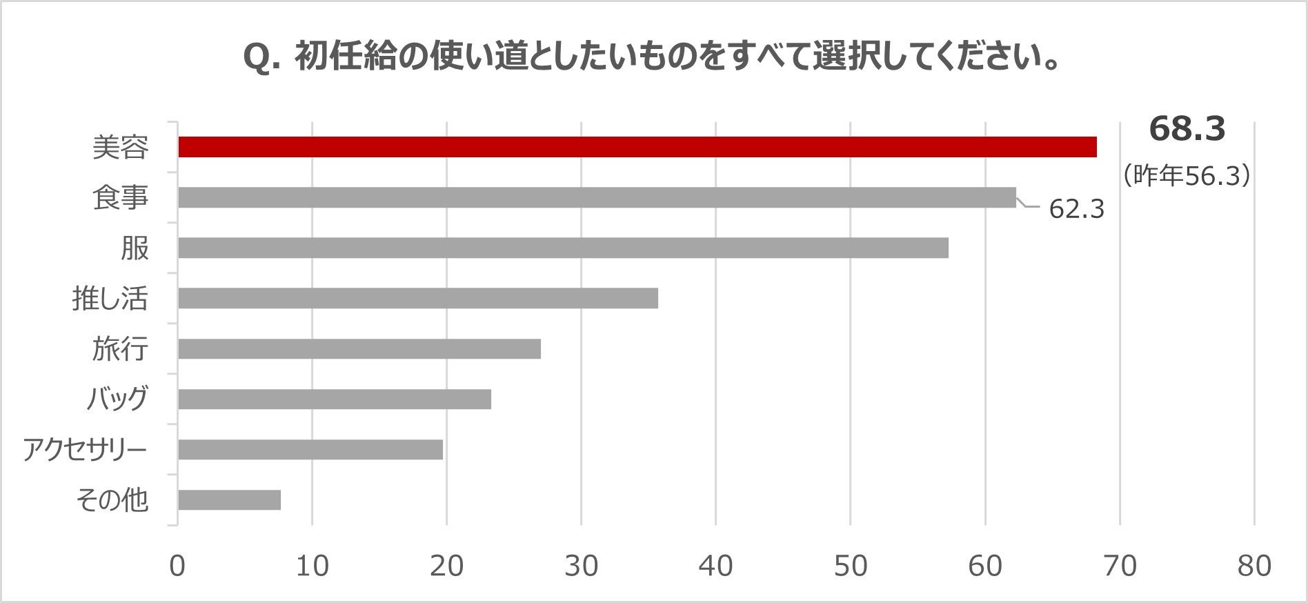 【調査概要】調査方法:インターネット、調査期間:2023年3月実施、調査対象:300人(初任給を美容(メイクやヘアケアを含む)にお金を使いたいと思うと回答した、2023年4月入社の2000年生まれ新社会人の女性)