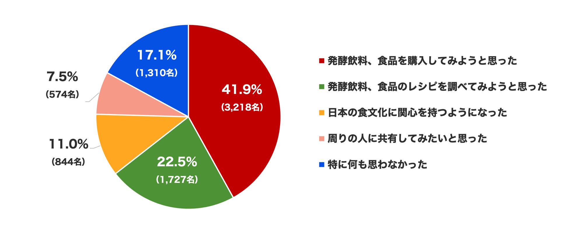 6,363名(=全体の約83%)が発酵食品の購入やレシピへの関心を持つといった回答が集まり、8月5日の「発酵の日」に向けて発酵食品への関心が高まる結果となりました。