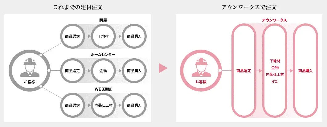 「アウンワークス」は、建築資材を中心に41万点以上(2026年2月現在)の商品を取り扱う、日本最大級のプロ向け建材通販サイトです。材料発注におけるさまざまな課題を解決し、日々時間に追われている現場をサポートするサービスを提供しています。