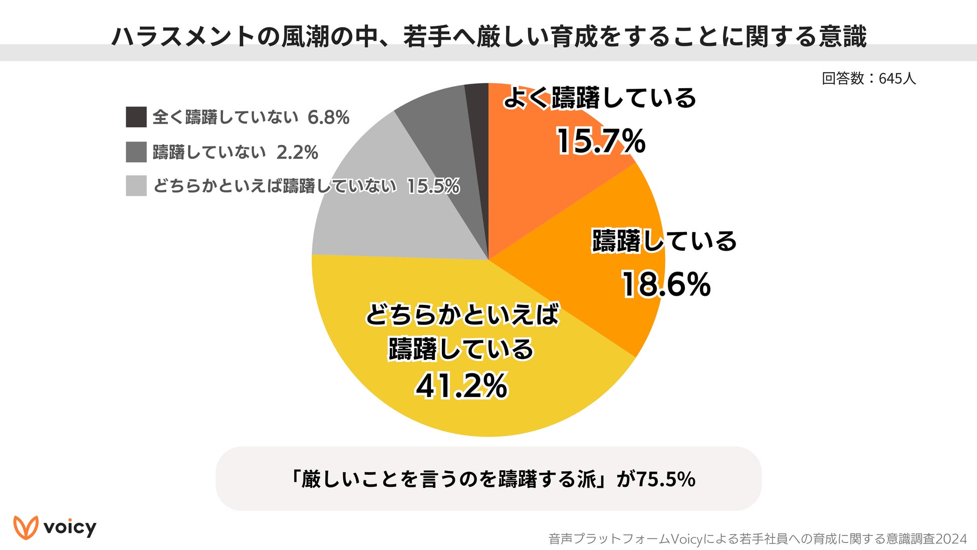 Voicyは、Voicyのユーザー645名を対象に、若手社員の育成に関する意識調査を実施しました。回答者へ「ハラスメントを意識して、若手社員へ厳しいことを言うのを躊躇したことがあるか」という質問に対し、「どちらかといえば躊躇している」が41.2%と最多で「躊躇している」18,6%、「よく躊躇している」が15.7%と続きました。合算すると約8割の人がハラスメントを意識して厳しいことを言うことに萎縮している「ハラ萎縮」経験があることがわかりました。