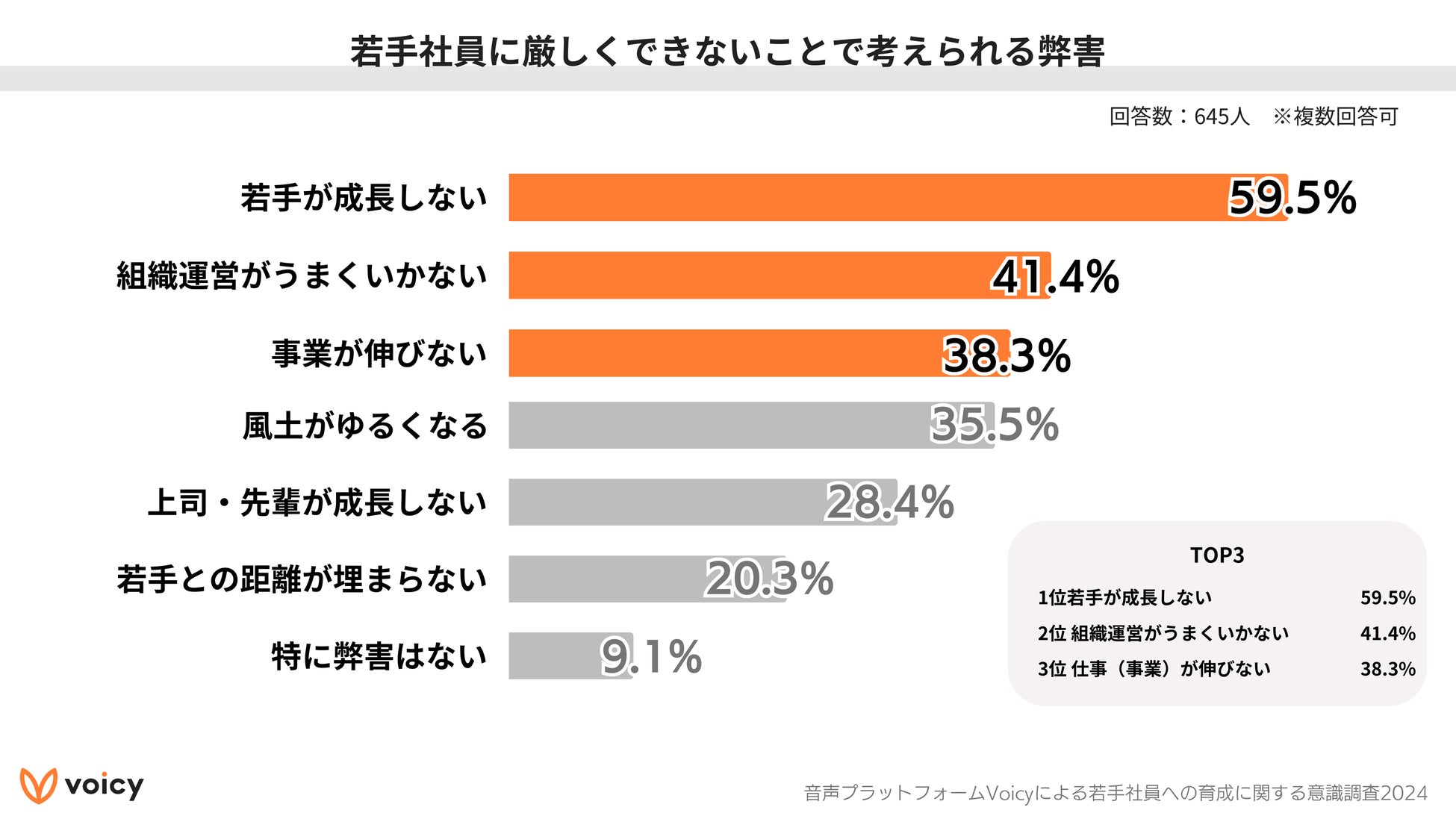 回答者全体の645人へ「若手社員に厳しくできないことで考えられる弊害」を聞くと、若手が成長しない」が59.5%で最多になり、次いで「組織運営がうまくいかない」が41.4%、「事業が伸びない」が38.3%でした。
