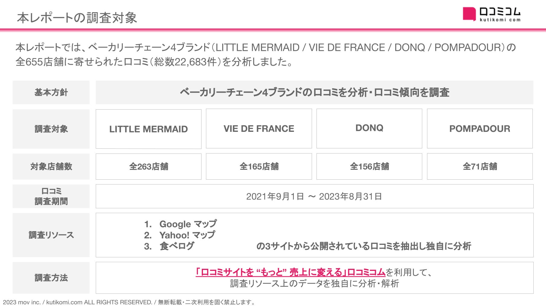 今回は、ベーカリーチェーン4ブランド(LITTLE MERMAID / VIE DE FRANCE / DONQ / POMPADOUR)に寄せられた約2.2万件の口コミを調査、比較検証をしました。