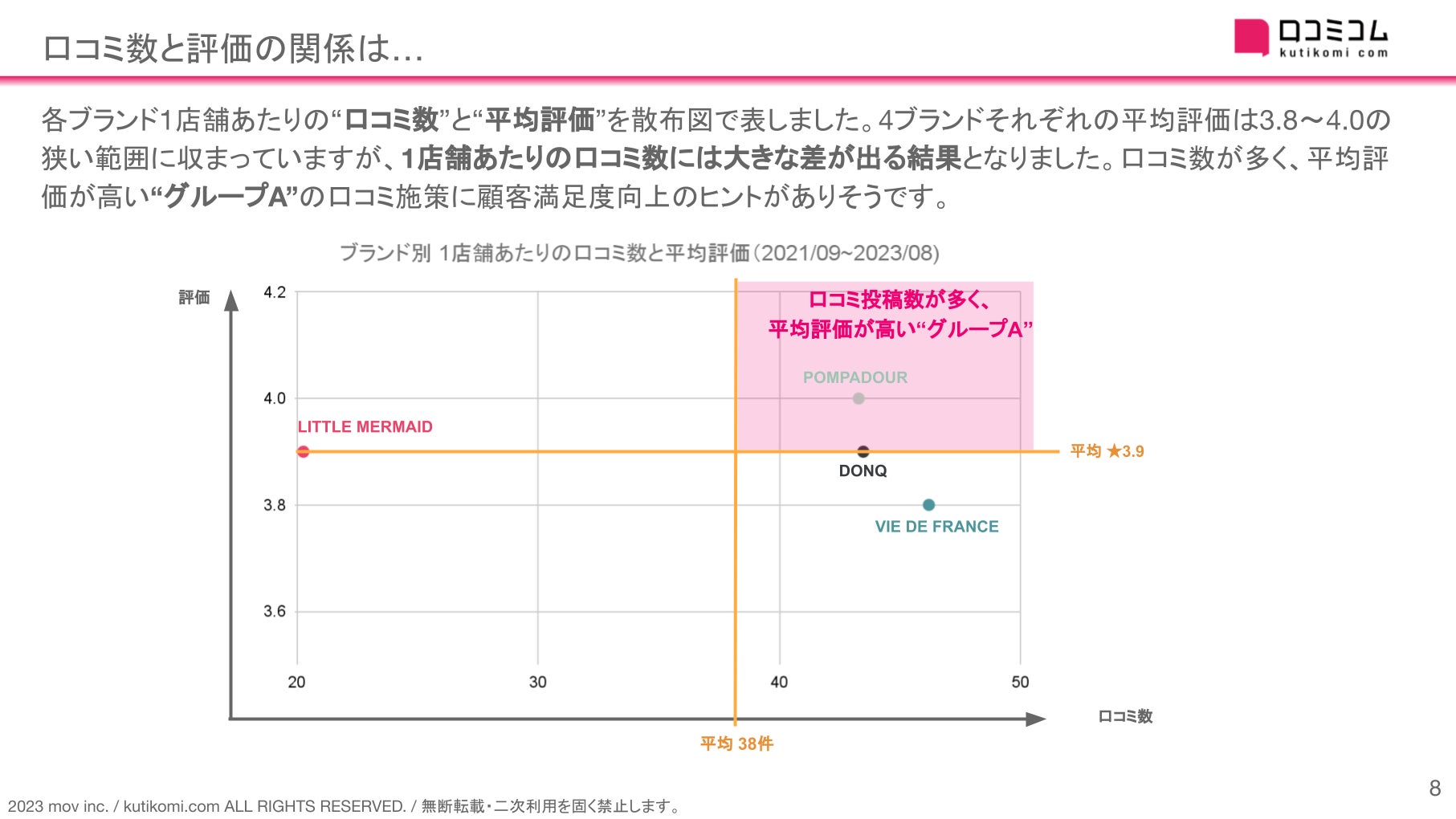 各ブランド1店舗あたりの“口コミ数”と“平均評価”を散布図で表しました。4ブランドそれぞれの平均評価は3.8~4.0の狭い範囲に収まっていますが、1店舗あたりの口コミ数には大きな差が出る結果となりました。
