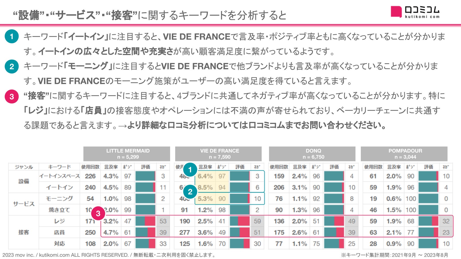 キーワード「モーニング」に注目するとVIE DE FRANCEで他ブランドよりも言及率が高くなっていることが分かります。VIE DE FRANCEのモーニング施策がユーザーの高い満足度を得ていると言えます。